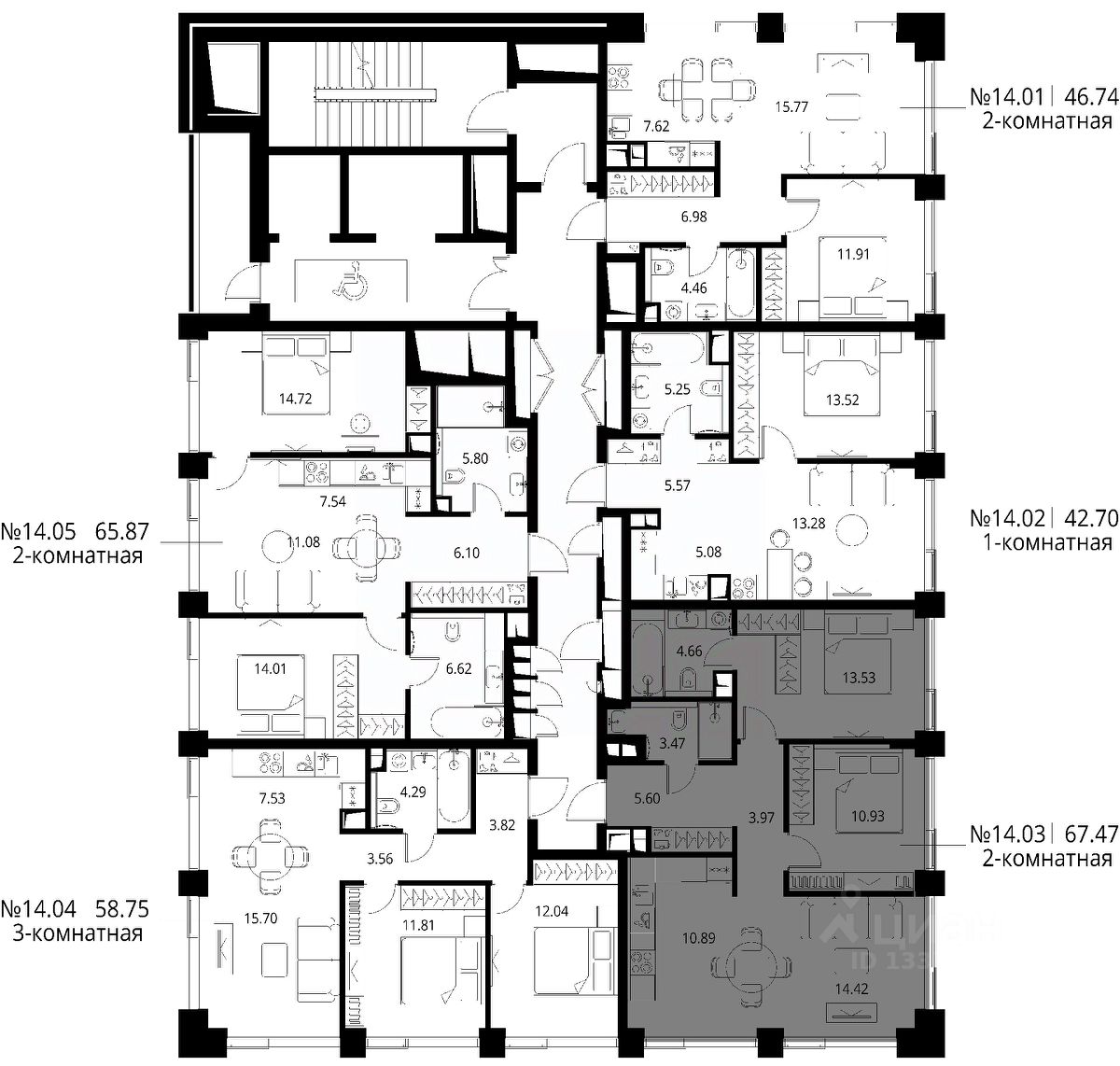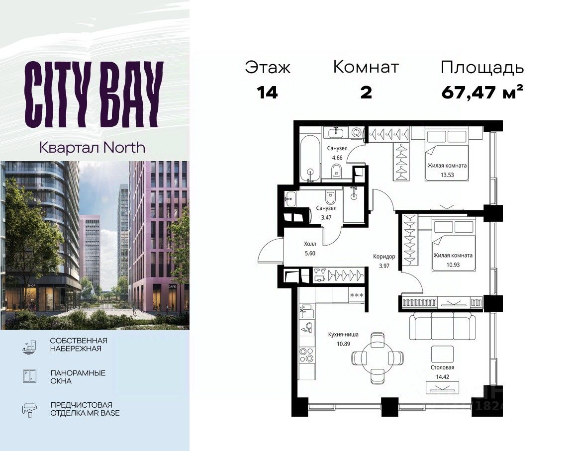 Продаётся 2-комнатная квартира общей площадью 67.47 м² с предчистовой отделкой в ЖК City Вау, квартале North, на 14-м этаже 24 этажного дома.