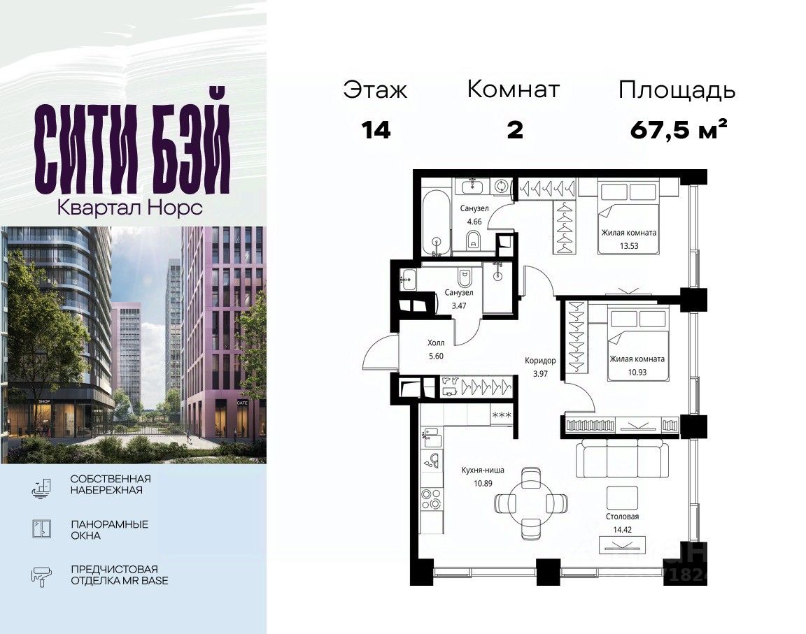 Продаётся 2-комнатная квартира общей площадью 67.47 м² с предчистовой отделкой в ЖК Сити Бэй, квартале Норс, на 14-м этаже 24 этажного дома.