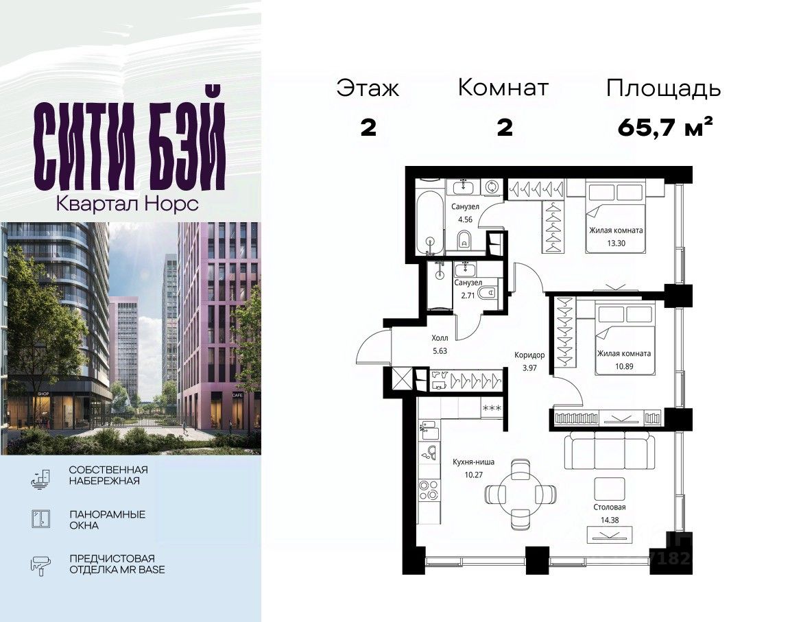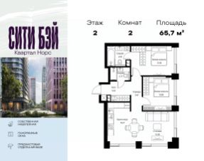 Продаётся 2-комнатная квартира общей площадью 65.71 м² с предчистовой отделкой в ЖК Сити Бэй, квартале Норс, на 2-м этаже 24 этажного дома.