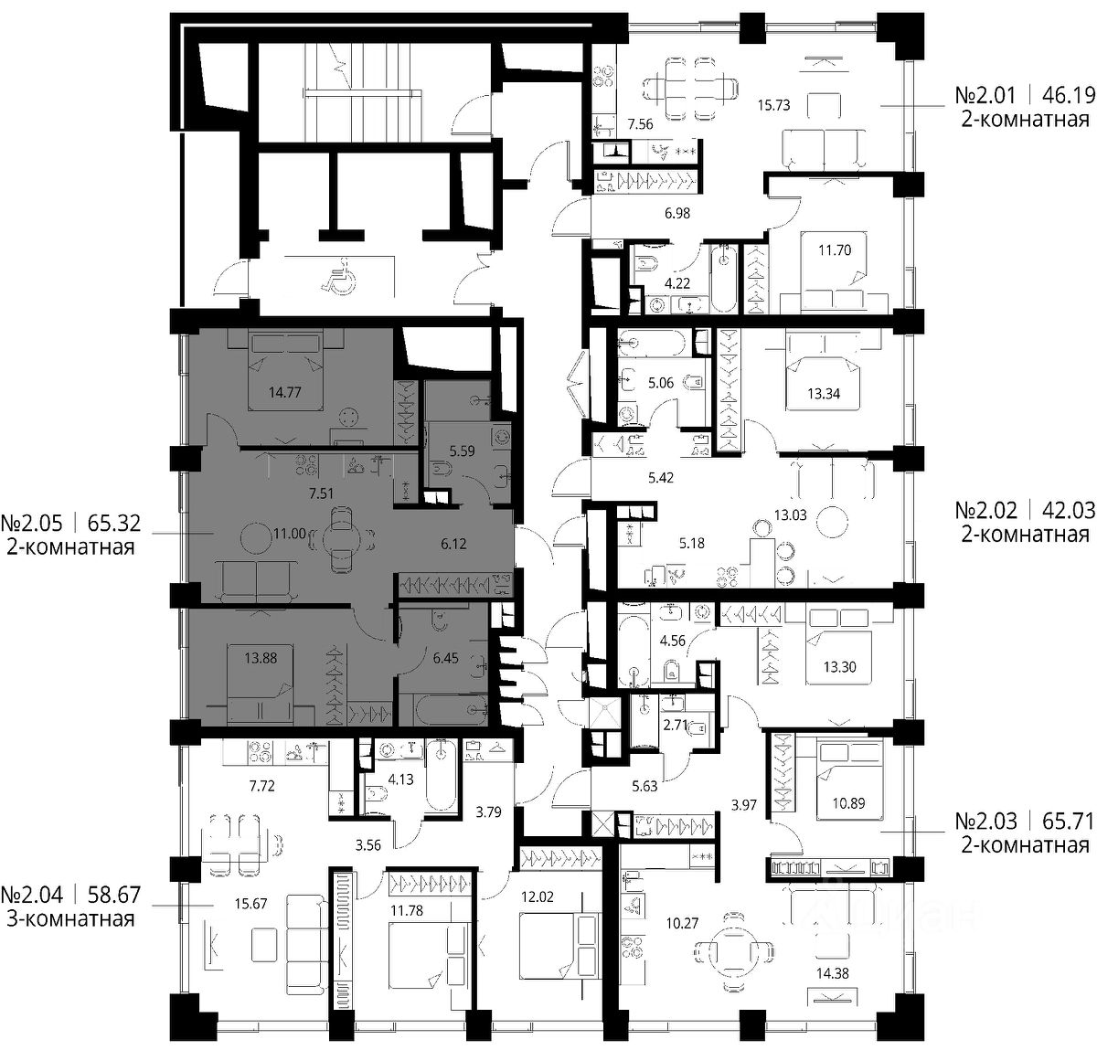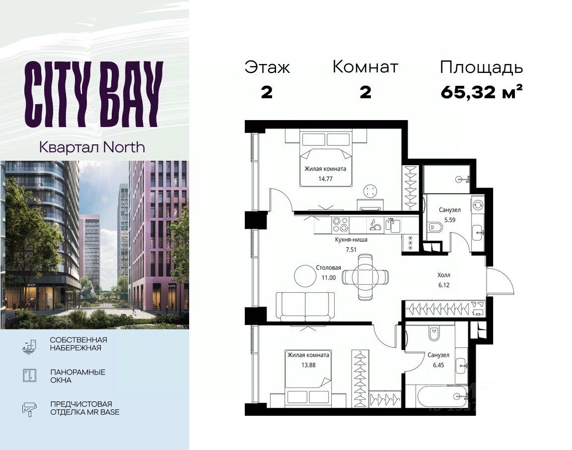 Продаётся 2-комнатная квартира общей площадью 65.32 м² с предчистовой отделкой в ЖК City Вау, квартале North, на 2-м этаже 24 этажного дома.