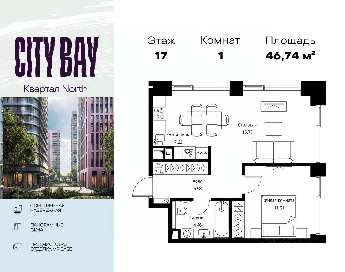 Продаётся 1-комнатная квартира общей площадью 46.74 м² с предчистовой отделкой в ЖК City Вау, квартале North, на 17-м этаже 24 этажного дома.