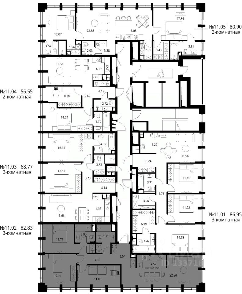 Продаётся 3-комнатная квартира общей площадью 82.83 м² с предчистовой отделкой в ЖК Сити Бэй, квартале Норс, на 11-м этаже 17 этажного дома.