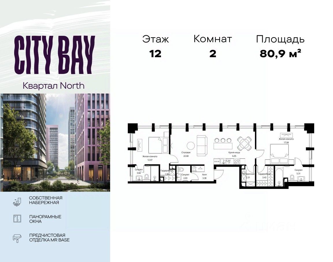 Продаётся 2-комнатная квартира общей площадью 80.90 м² с предчистовой отделкой в ЖК City Вау, квартале North, на 12-м этаже 17 этажного дома.