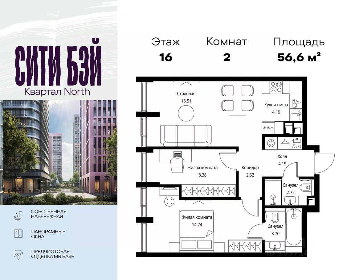 Продаётся 2-комнатная квартира общей площадью 56.55 м² с предчистовой отделкой в ЖК Сити Бэй, квартале North, на 16-м этаже 17 этажного дома.