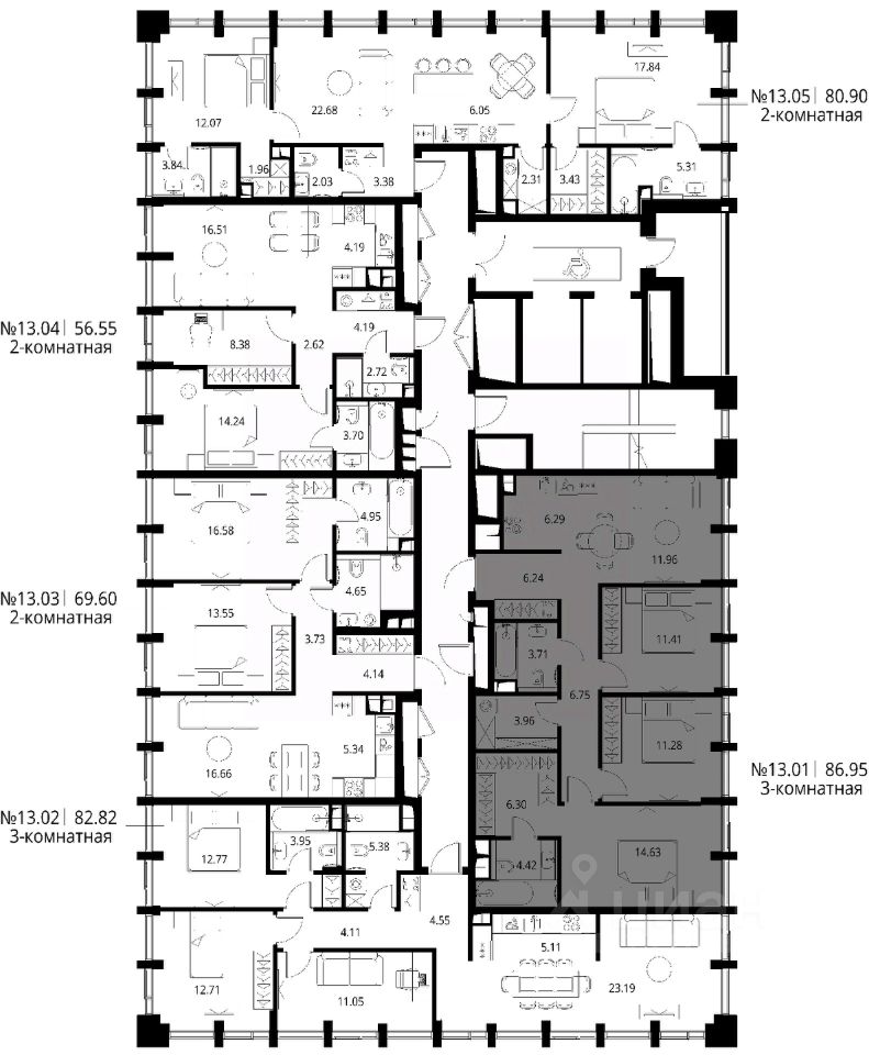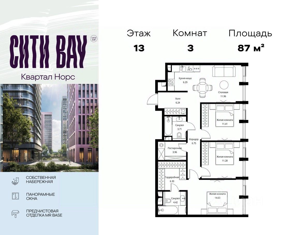 Продаётся 3-комнатная квартира общей площадью 86.95 м² с предчистовой отделкой в ЖК Сити Бэй, квартале Норс, на 13-м этаже 17 этажного дома.