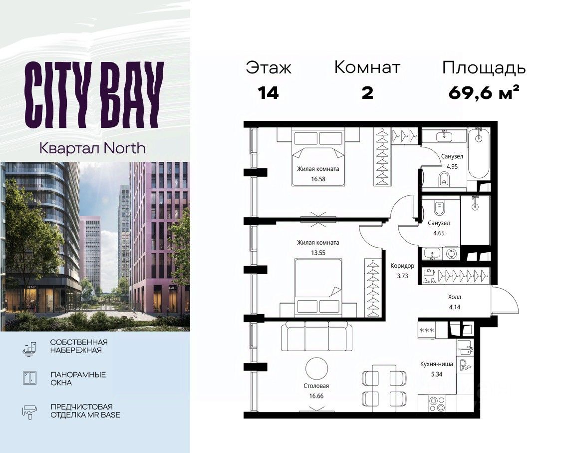 Продаётся 2-комнатная квартира общей площадью 69.60 м² с предчистовой отделкой в ЖК City Вау, квартале North, на 14-м этаже 17 этажного дома.