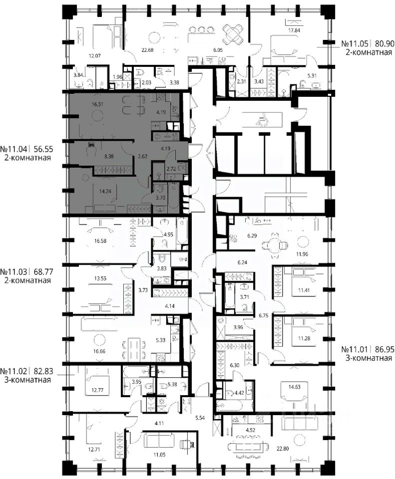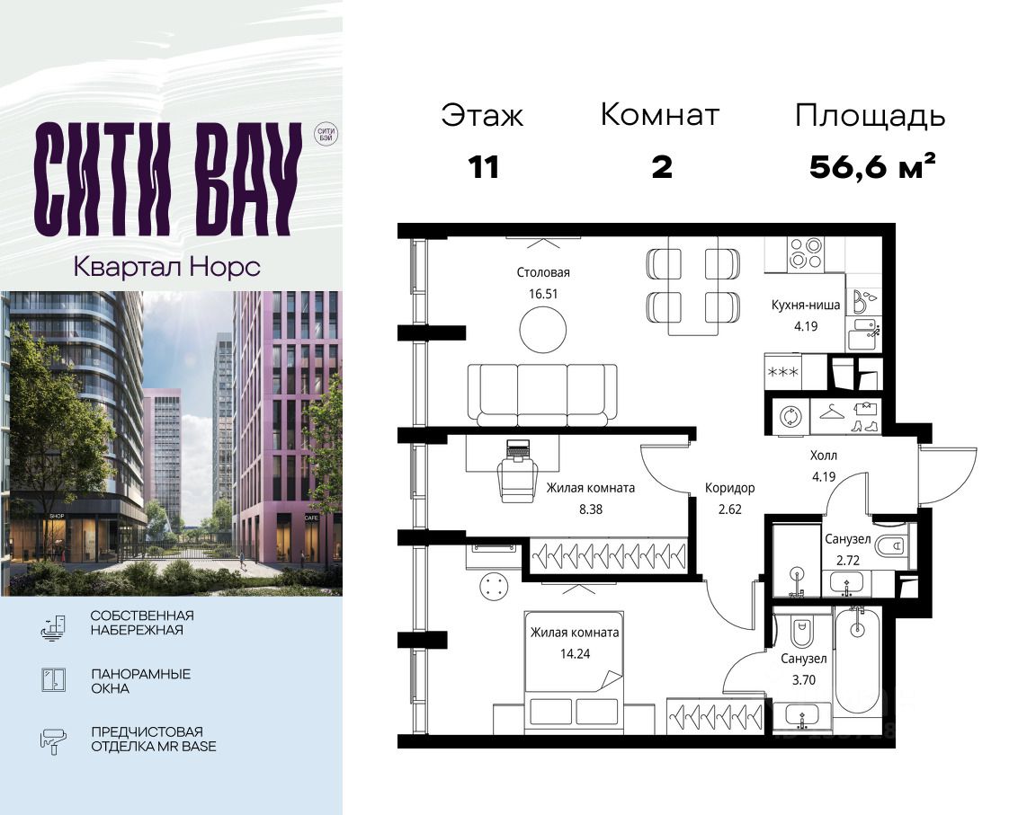 Продаётся 2-комнатная квартира общей площадью 56.55 м² с предчистовой отделкой в ЖК Сити Бэй, квартале Норс, на 11-м этаже 17 этажного дома.
