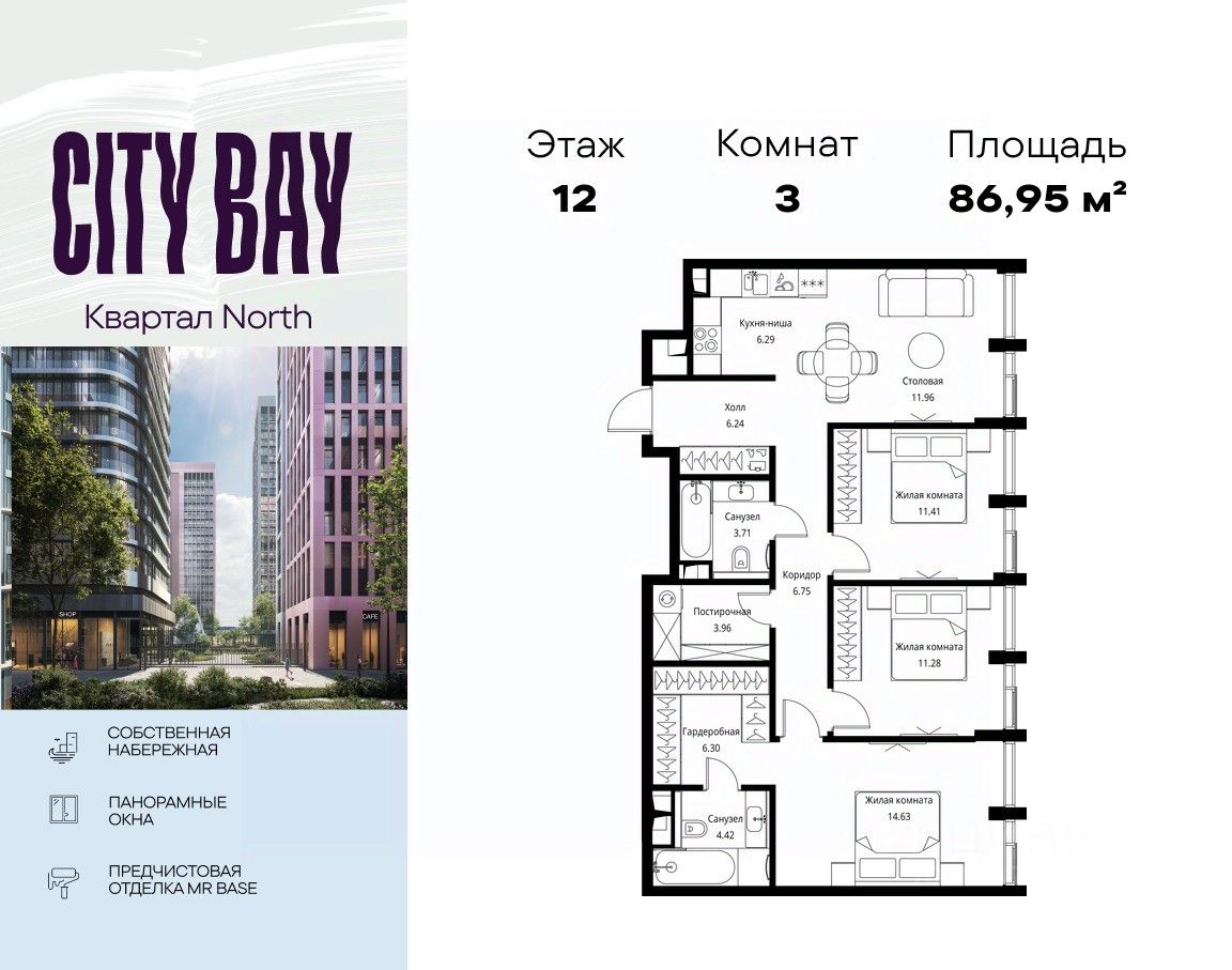 Продаётся 3-комнатная квартира общей площадью 86.95 м² с предчистовой отделкой в ЖК City Вау, квартале North, на 12-м этаже 17 этажного дома.