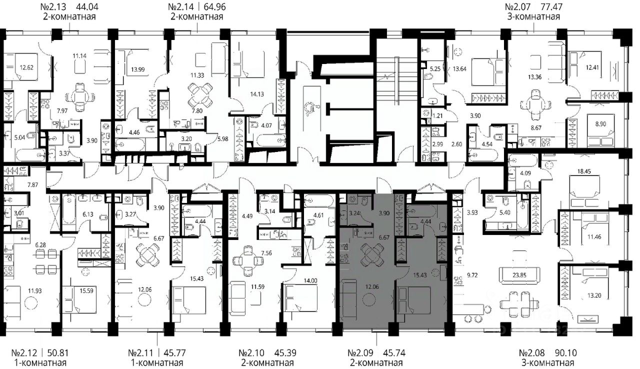 Продаётся 1-комнатная квартира общей площадью 45.74 м² с предчистовой отделкой в ЖК Сити Бэй, квартале Норс, на 2-м этаже 10 этажного дома.