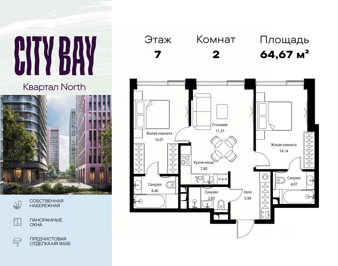 Продаётся 2-комнатная квартира общей площадью 64.67 м² с предчистовой отделкой в ЖК City Вау, квартале North, на 7-м этаже 10 этажного дома.