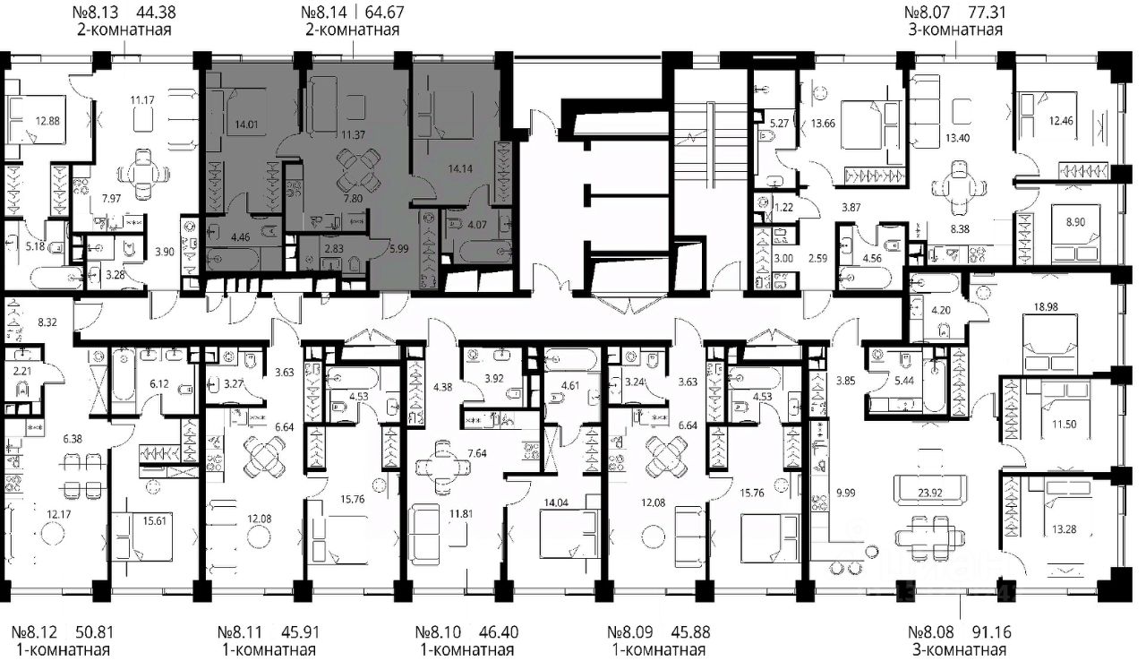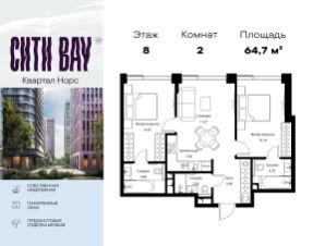 Продаётся 2-комнатная квартира общей площадью 64.67 м² с предчистовой отделкой в ЖК Сити Бэй, квартале Норс, на 8-м этаже 10 этажного дома.