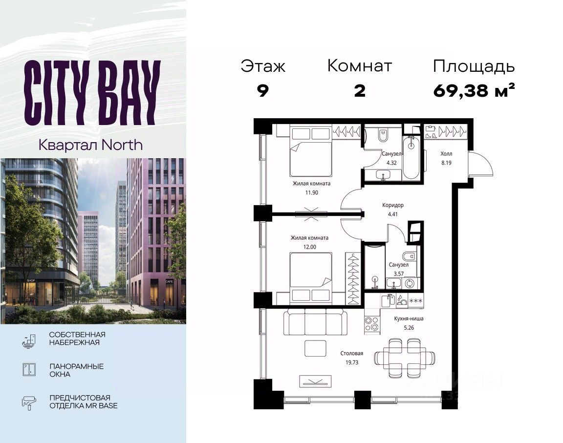 Продаётся 2-комнатная квартира общей площадью 69.38 м² с предчистовой отделкой в ЖК City Вау, квартале North, на 9-м этаже 10 этажного дома.