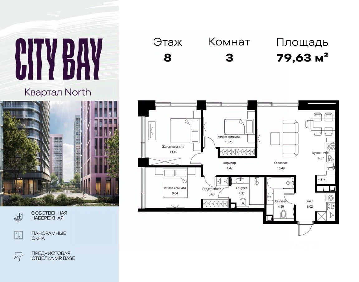 Продаётся 3-комнатная квартира общей площадью 79.63 м² с предчистовой отделкой в ЖК City Вау, квартале North, на 8-м этаже 10 этажного дома.