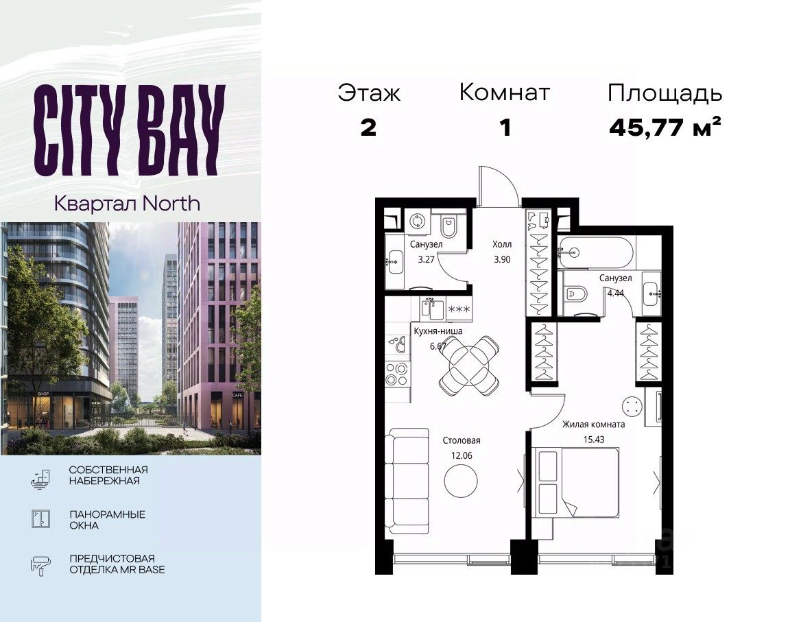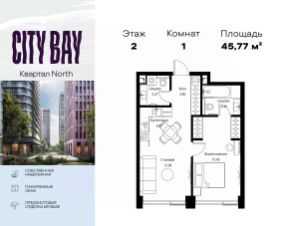 Продаётся 1-комнатная квартира общей площадью 45.77 м² с предчистовой отделкой в ЖК City Вау, квартале North, на 2-м этаже 10 этажного дома.