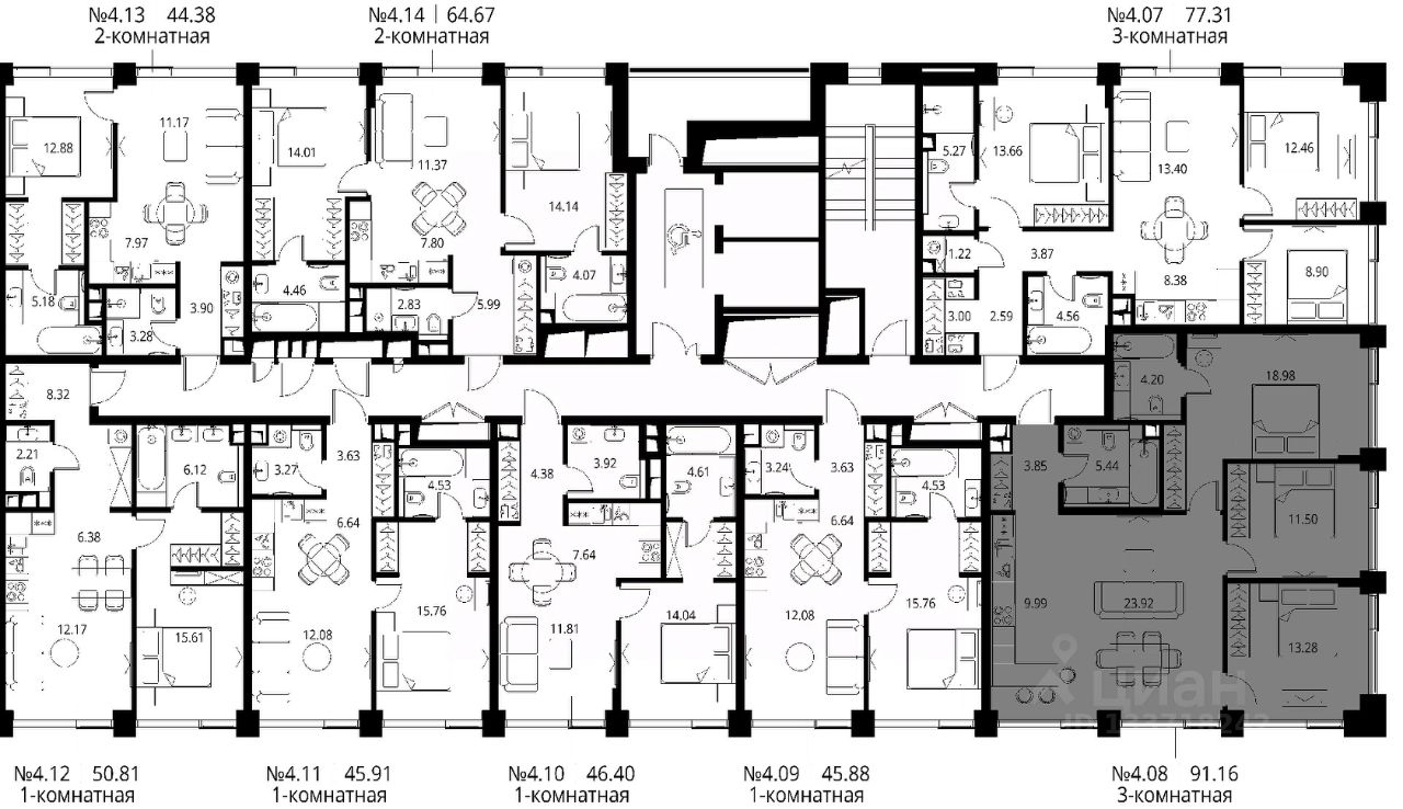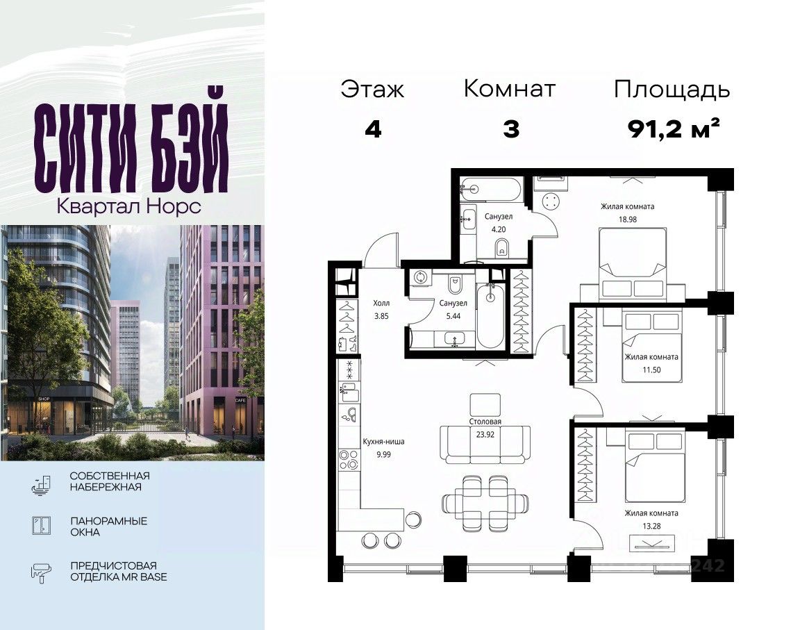 Продаётся 3-комнатная квартира общей площадью 91.16 м² с предчистовой отделкой в ЖК Сити Бэй, квартале Норс, на 4-м этаже 10 этажного дома.