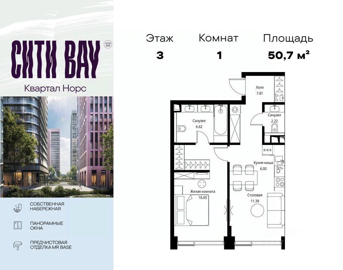 Продаётся 1-комнатная квартира общей площадью 50.69 м² с предчистовой отделкой в ЖК Сити Бэй, квартале Норс, на 3-м этаже 10 этажного дома.