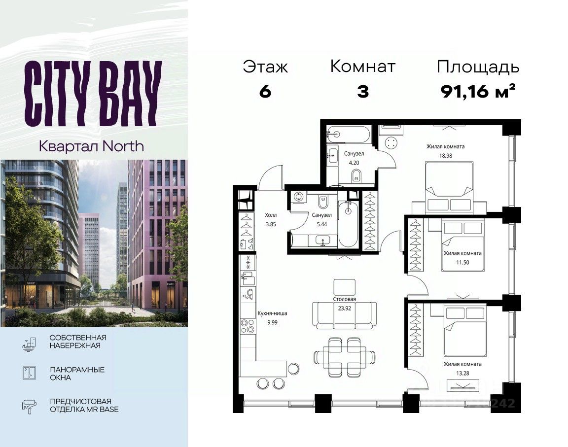 Продаётся 3-комнатная квартира общей площадью 91.16 м² с предчистовой отделкой в ЖК City Вау, квартале North, на 6-м этаже 10 этажного дома.