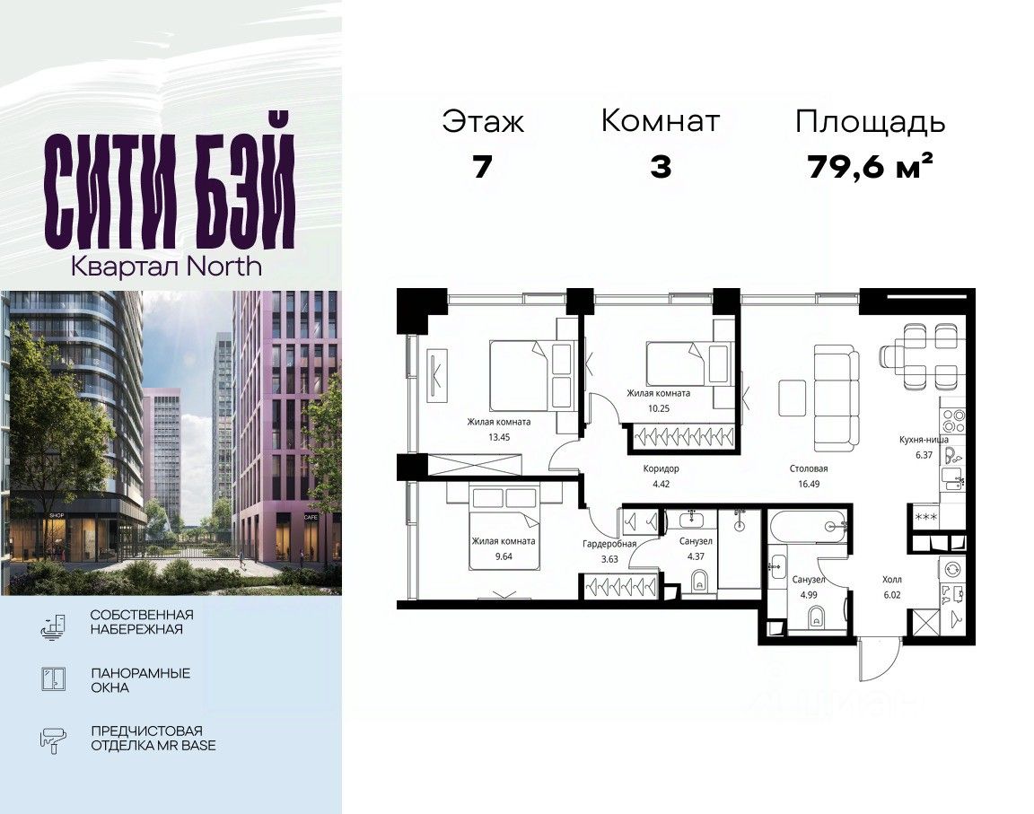 Продаётся 3-комнатная квартира общей площадью 79.63 м² с предчистовой отделкой в ЖК Сити Бэй, квартале Норс, на 7-м этаже 10 этажного дома.