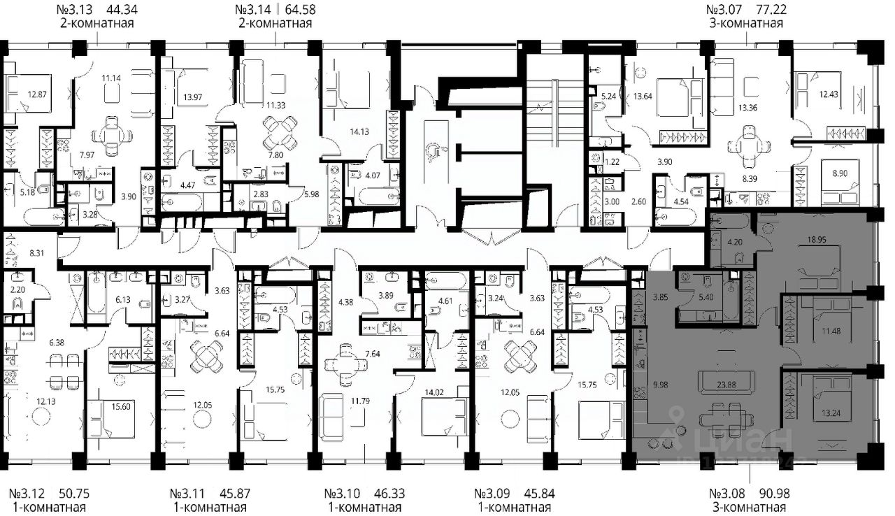 Продаётся 3-комнатная квартира общей площадью 90.98 м² с предчистовой отделкой в ЖК Сити Бэй, квартале Норс, на 3-м этаже 10 этажного дома.