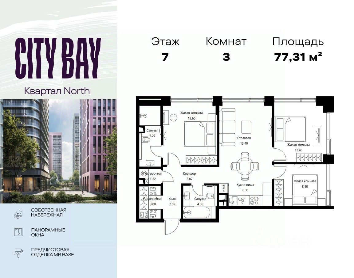 Продаётся 3-комнатная квартира общей площадью 77.31 м² с предчистовой отделкой в ЖК City Вау, квартале North, на 7-м этаже 10 этажного дома.