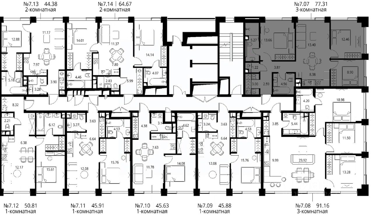 Продаётся 3-комнатная квартира общей площадью 77.31 м² с предчистовой отделкой в ЖК Сити Бэй, квартале Норс, на 7-м этаже 10 этажного дома.