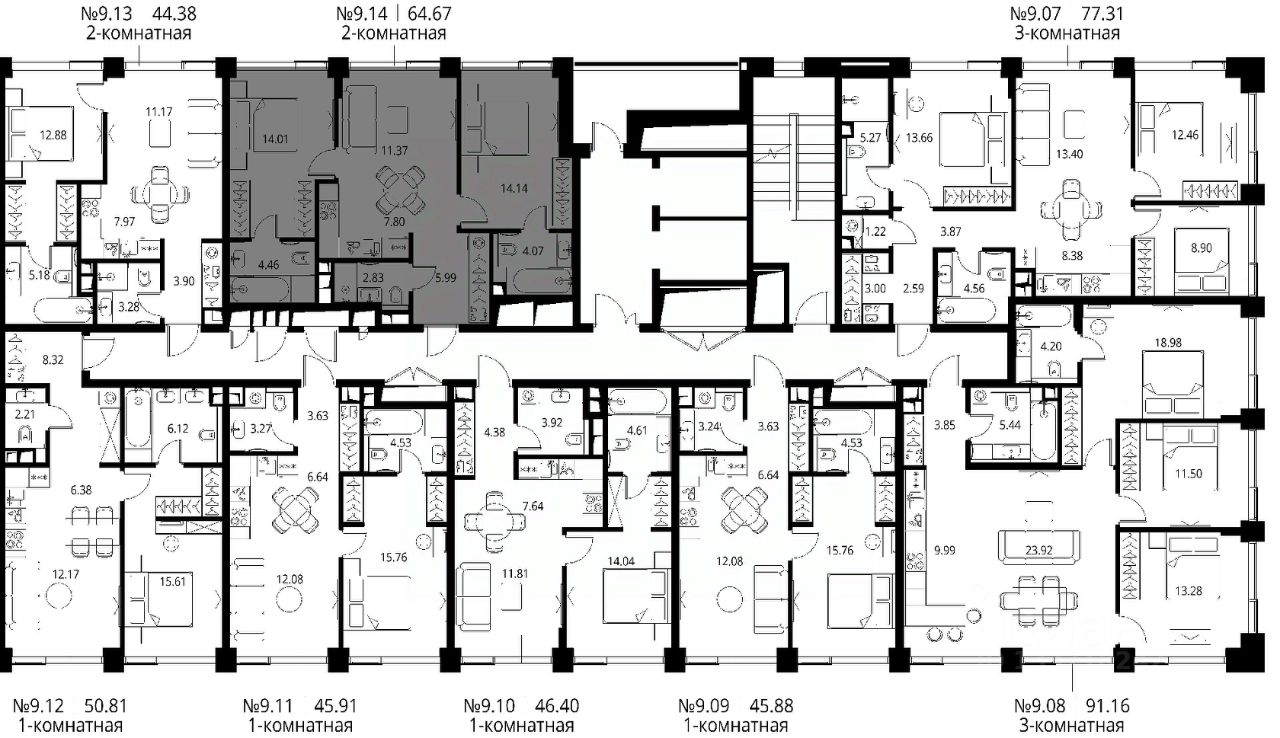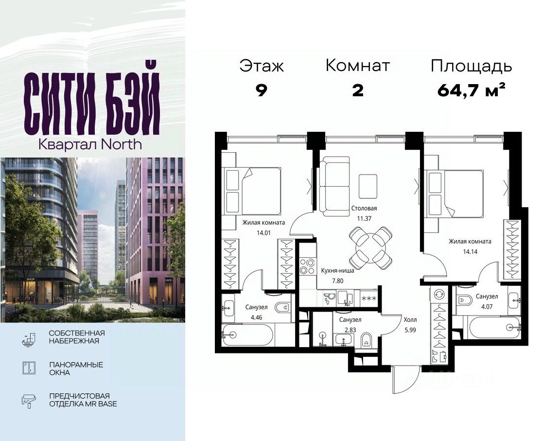 Продаётся 2-комнатная квартира общей площадью 64.67 м² с предчистовой отделкой в ЖК Сити Бэй, квартале Норс, на 9-м этаже 10 этажного дома.
