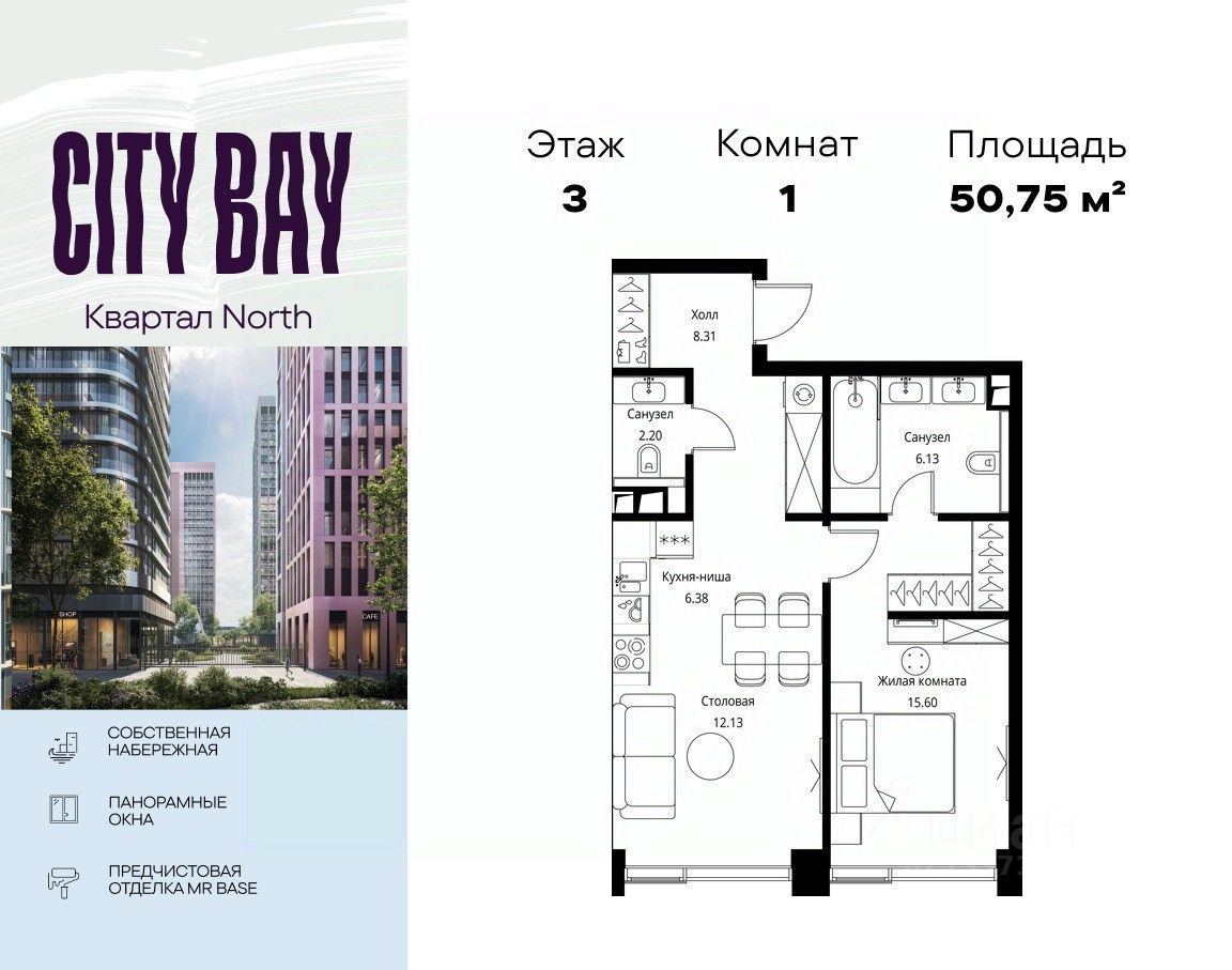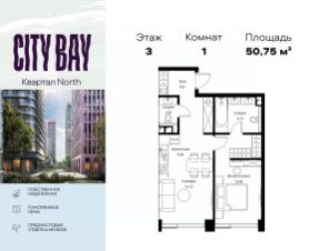 Продаётся 1-комнатная квартира общей площадью 50.75 м² с предчистовой отделкой в ЖК City Вау, квартале North, на 3-м этаже 10 этажного дома.