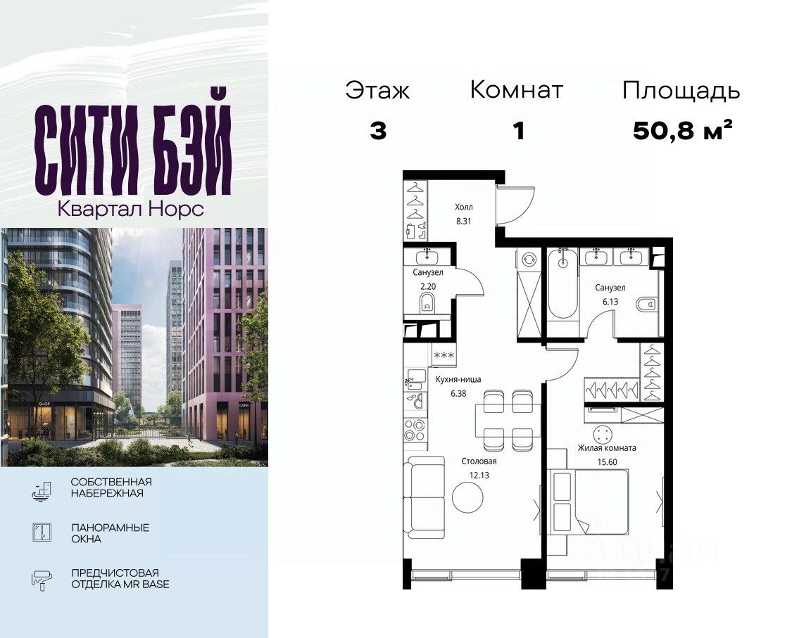 Продаётся 1-комнатная квартира общей площадью 50.75 м² с предчистовой отделкой в ЖК Сити Бэй, квартале Норс, на 3-м этаже 10 этажного дома.