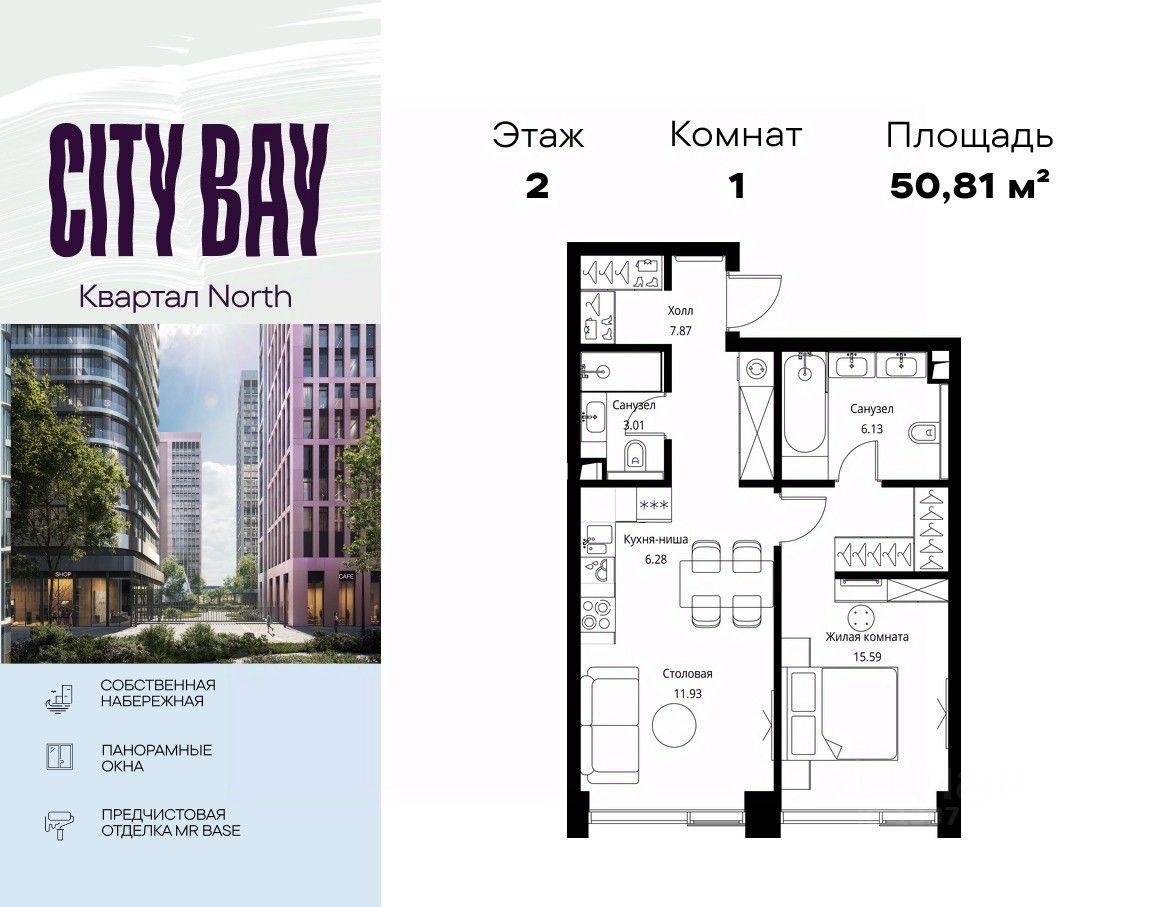 Продаётся 1-комнатная квартира общей площадью 50.81 м² с предчистовой отделкой в ЖК City Вау, квартале North, на 2-м этаже 10 этажного дома.