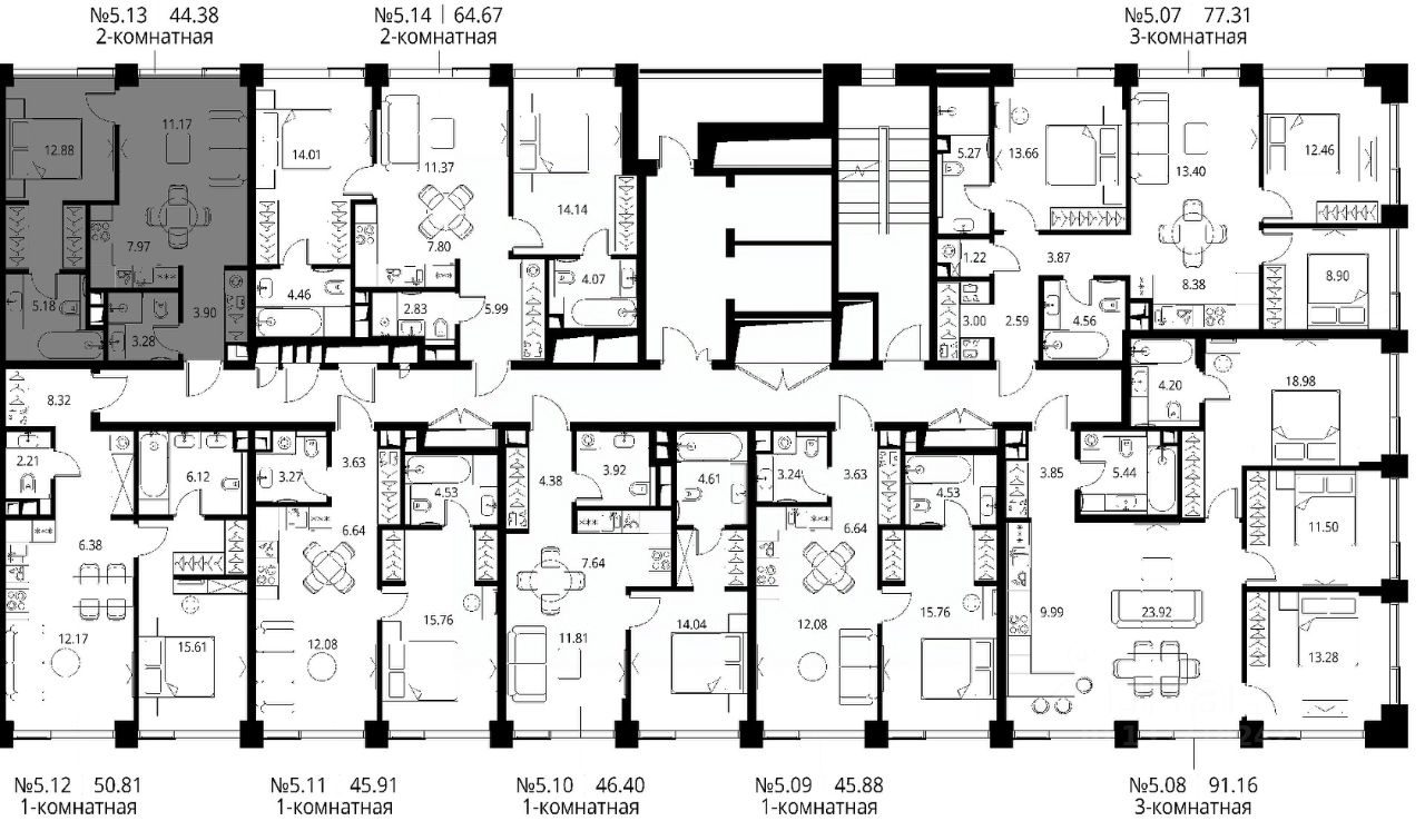 Продаётся 1-комнатная квартира общей площадью 44.38 м² с предчистовой отделкой в ЖК Сити Бэй, квартале Норс, на 5-м этаже 10 этажного дома.