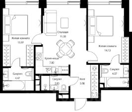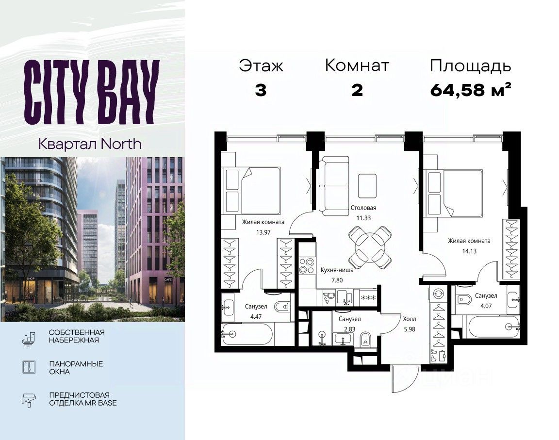 Продаётся 2-комнатная квартира общей площадью 64.58 м² с предчистовой отделкой в ЖК City Вау, квартале North, на 3-м этаже 10 этажного дома.