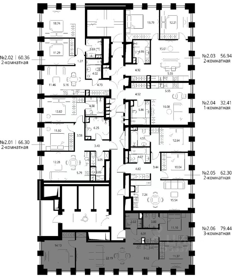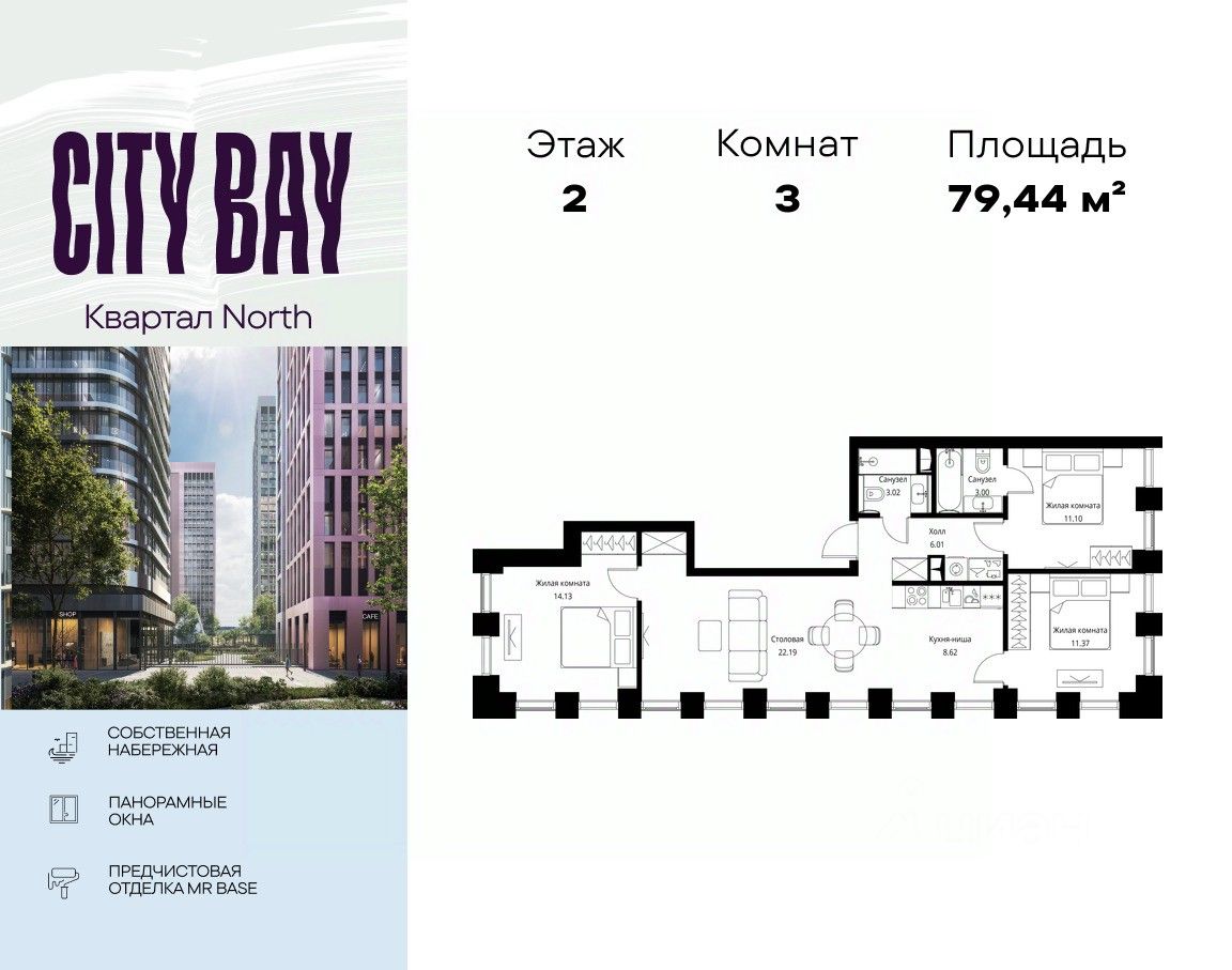 Продаётся 3-комнатная квартира общей площадью 79.44 м² с предчистовой отделкой в ЖК City Вау, квартале North, на 2-м этаже 27 этажного дома.