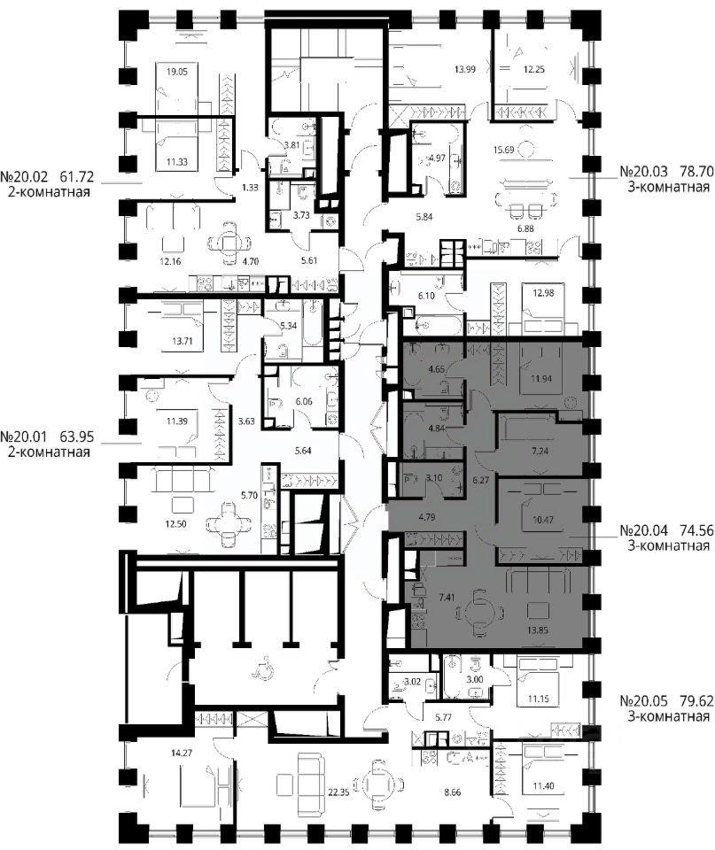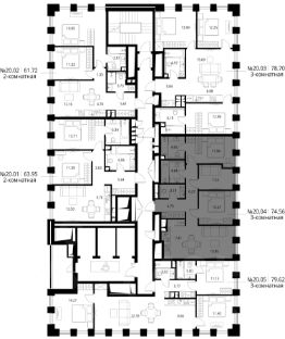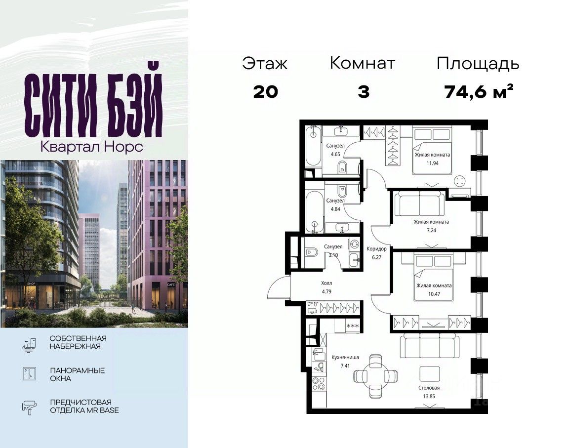 Продаётся 3-комнатная квартира общей площадью 74.56 м² с предчистовой отделкой в ЖК Сити Бэй, квартале Норс, на 20-м этаже 27 этажного дома.