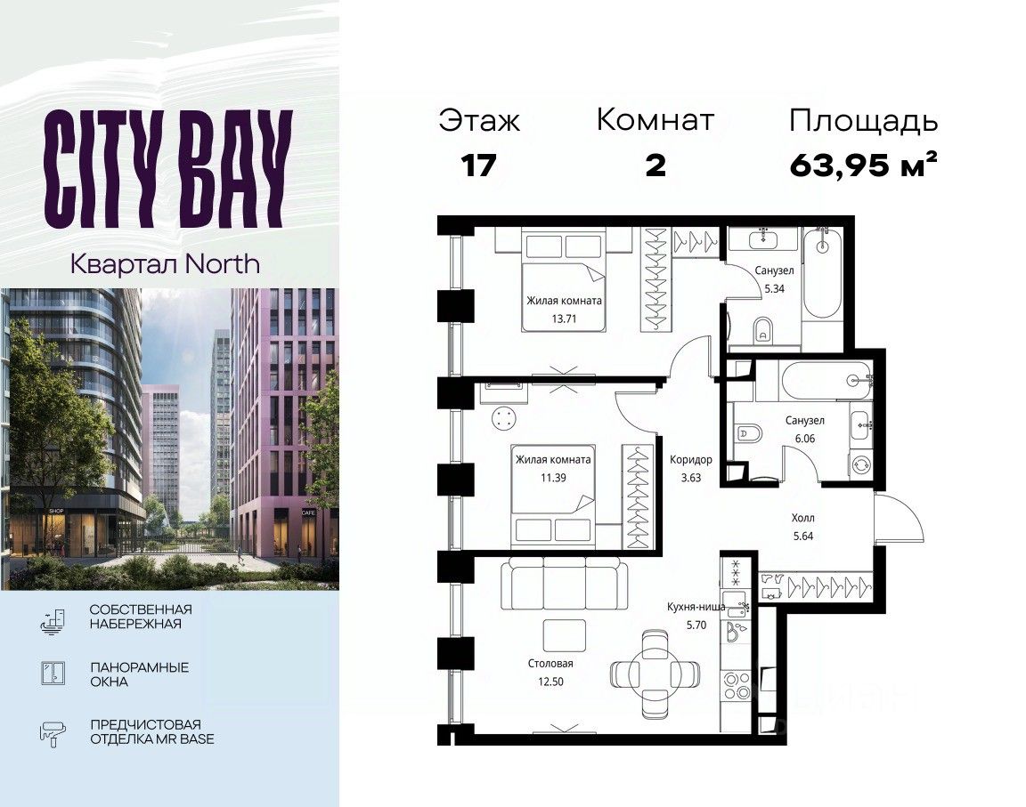 Продаётся 2-комнатная квартира общей площадью 63.95 м² с предчистовой отделкой в ЖК City Вау, квартале North, на 17-м этаже 27 этажного дома.