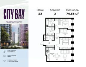 Продаётся 3-комнатная квартира общей площадью 74.56 м² с предчистовой отделкой в ЖК City Вау, квартале North, на 23-м этаже 27 этажного дома.