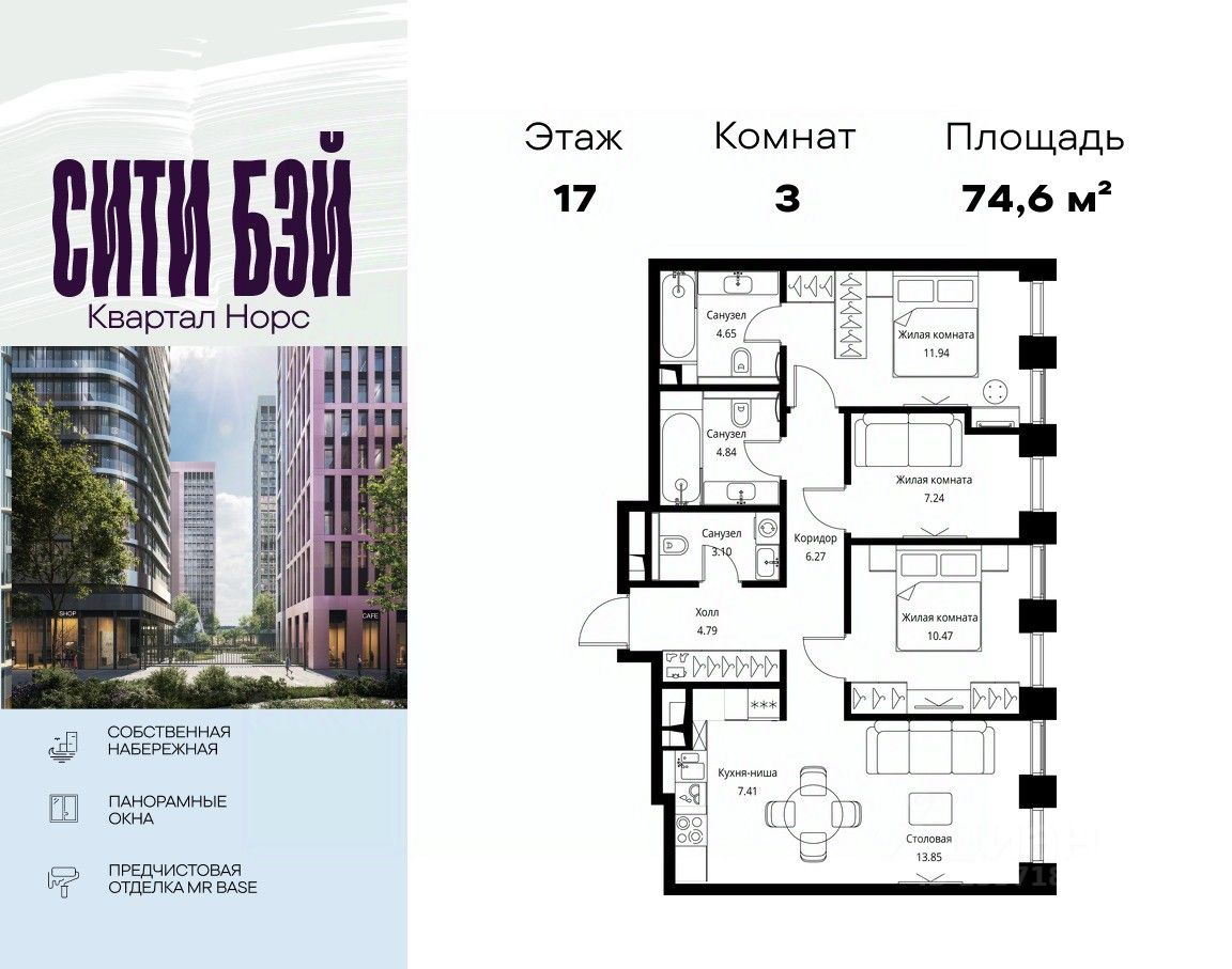 Продаётся 3-комнатная квартира общей площадью 74.56 м² с предчистовой отделкой в ЖК Сити Бэй, квартале Норс, на 17-м этаже 27 этажного дома.