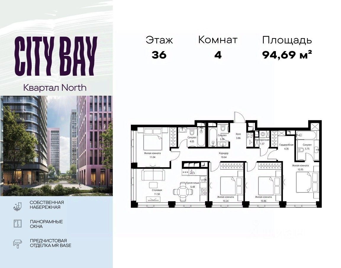 Продаётся 4-комнатная квартира общей площадью 94.69 м² с предчистовой отделкой в ЖК City Вау, квартале North, на 36-м этаже 48 этажного дома.