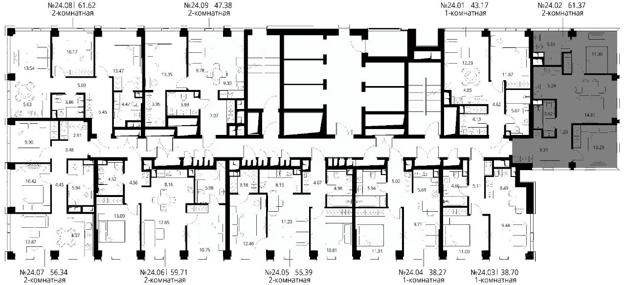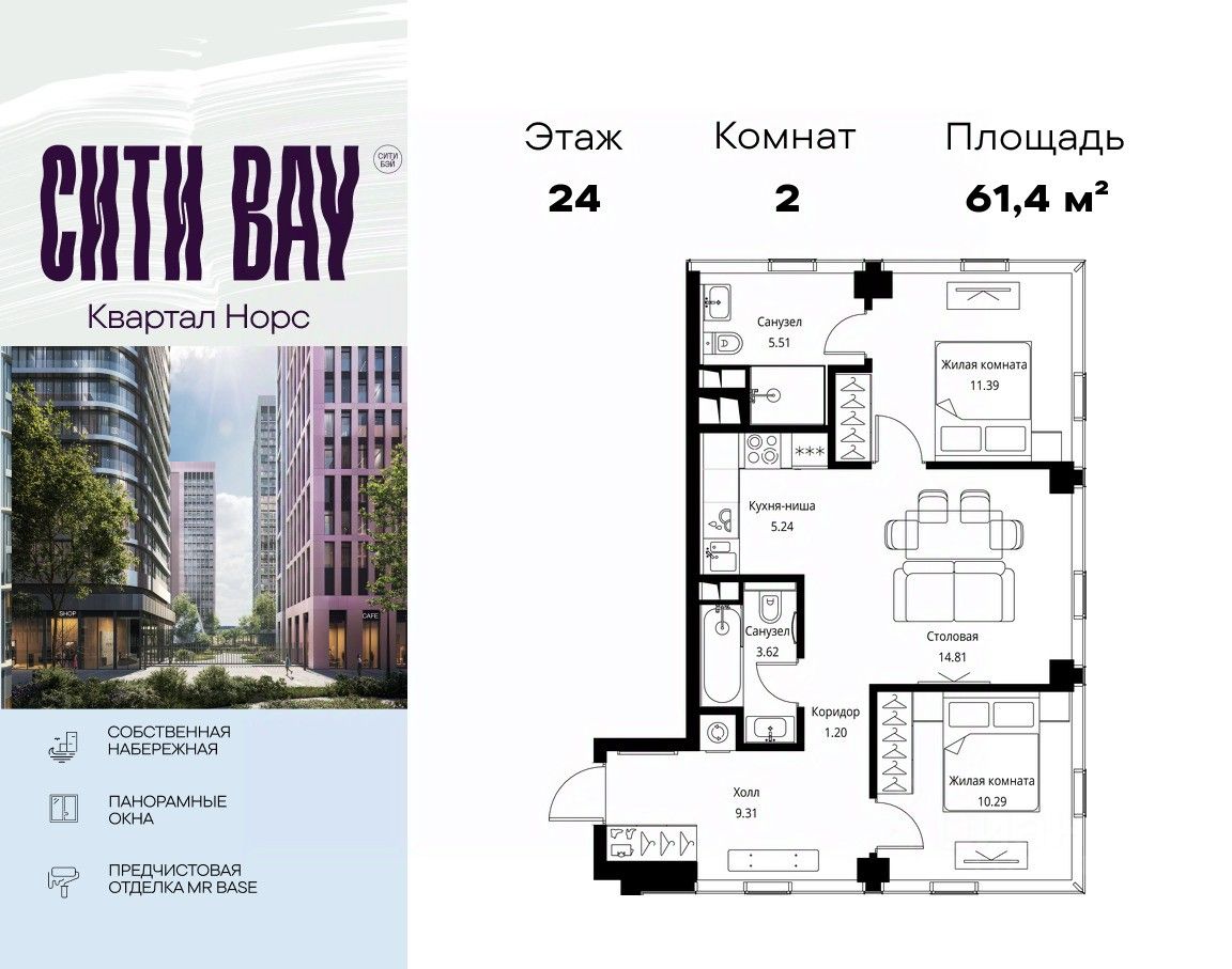 Продаётся 2-комнатная квартира общей площадью 61.37 м² с предчистовой отделкой в ЖК Сити Бэй, квартале Норс, на 24-м этаже 48 этажного дома.