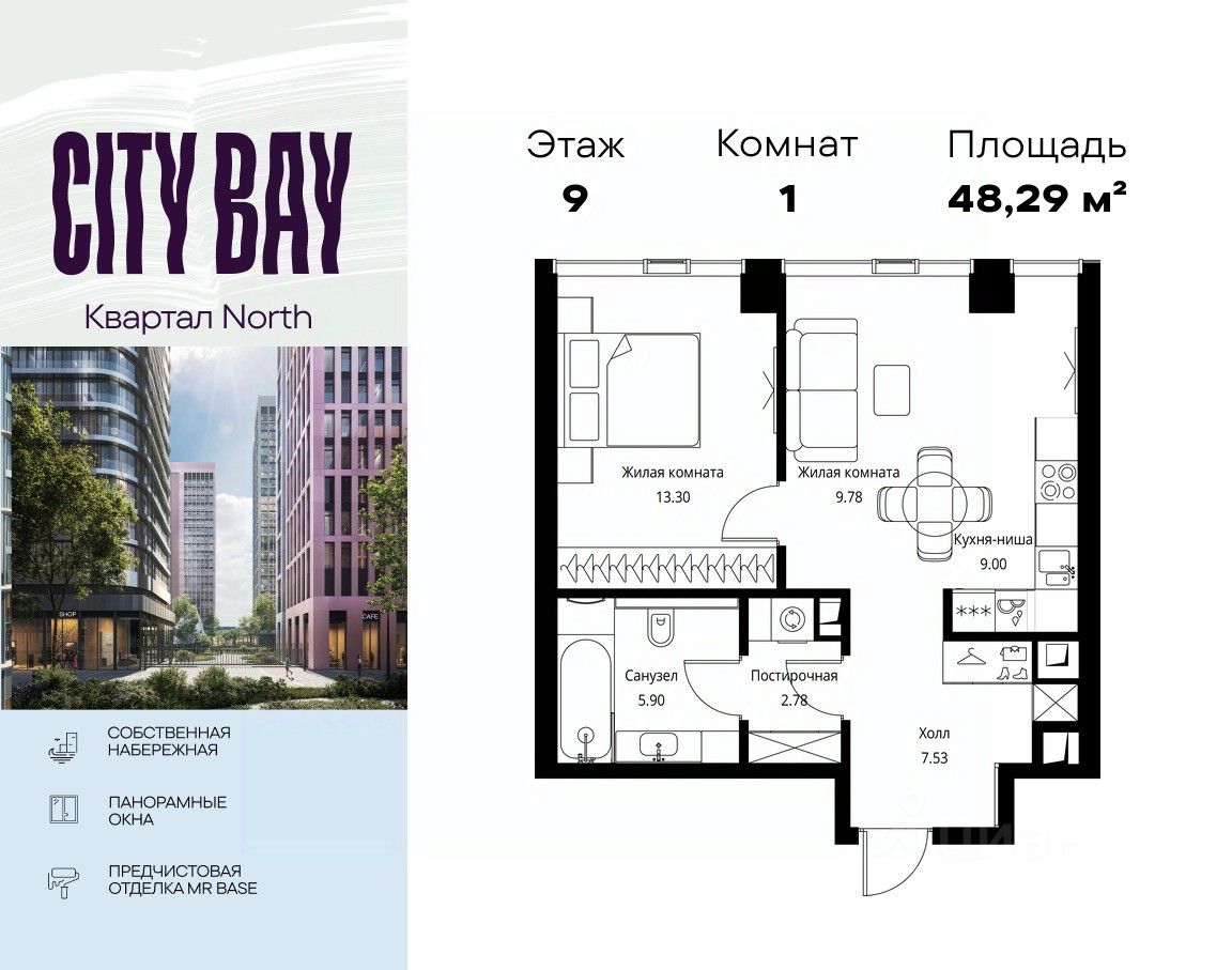 Продаётся 1-комнатная квартира общей площадью 48.29 м² с предчистовой отделкой в ЖК City Вау, квартале North, на 9-м этаже 48 этажного дома.