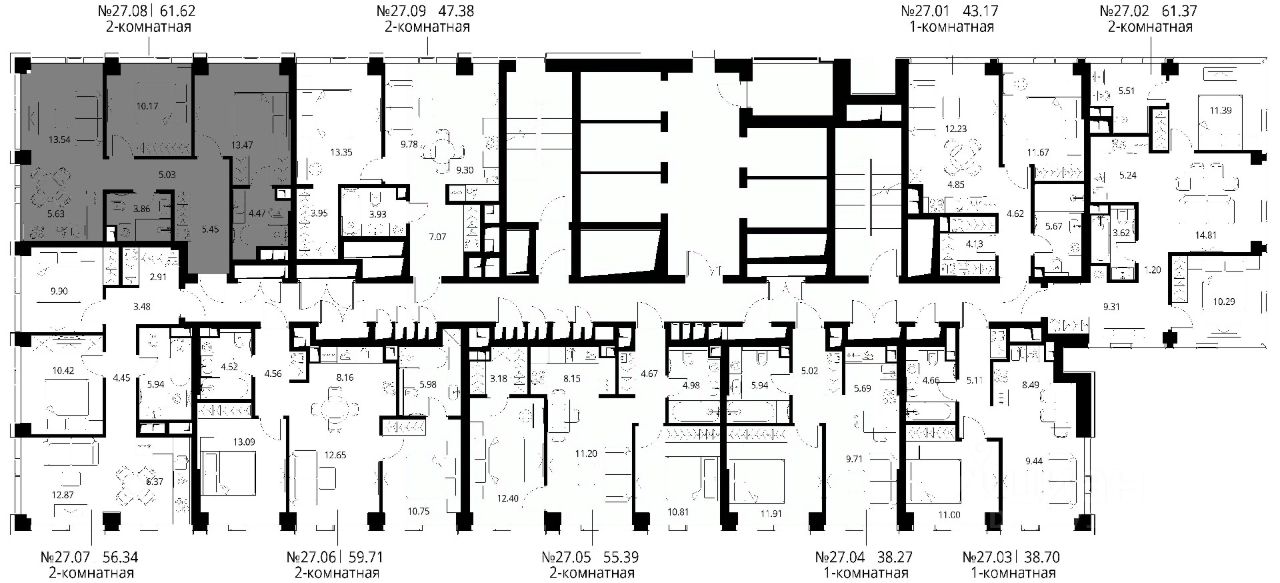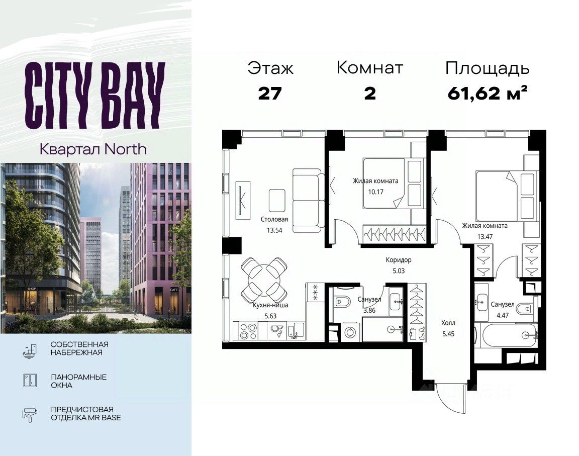 Продаётся 2-комнатная квартира общей площадью 61.62 м² с предчистовой отделкой в ЖК City Вау, квартале North, на 27-м этаже 48 этажного дома.
