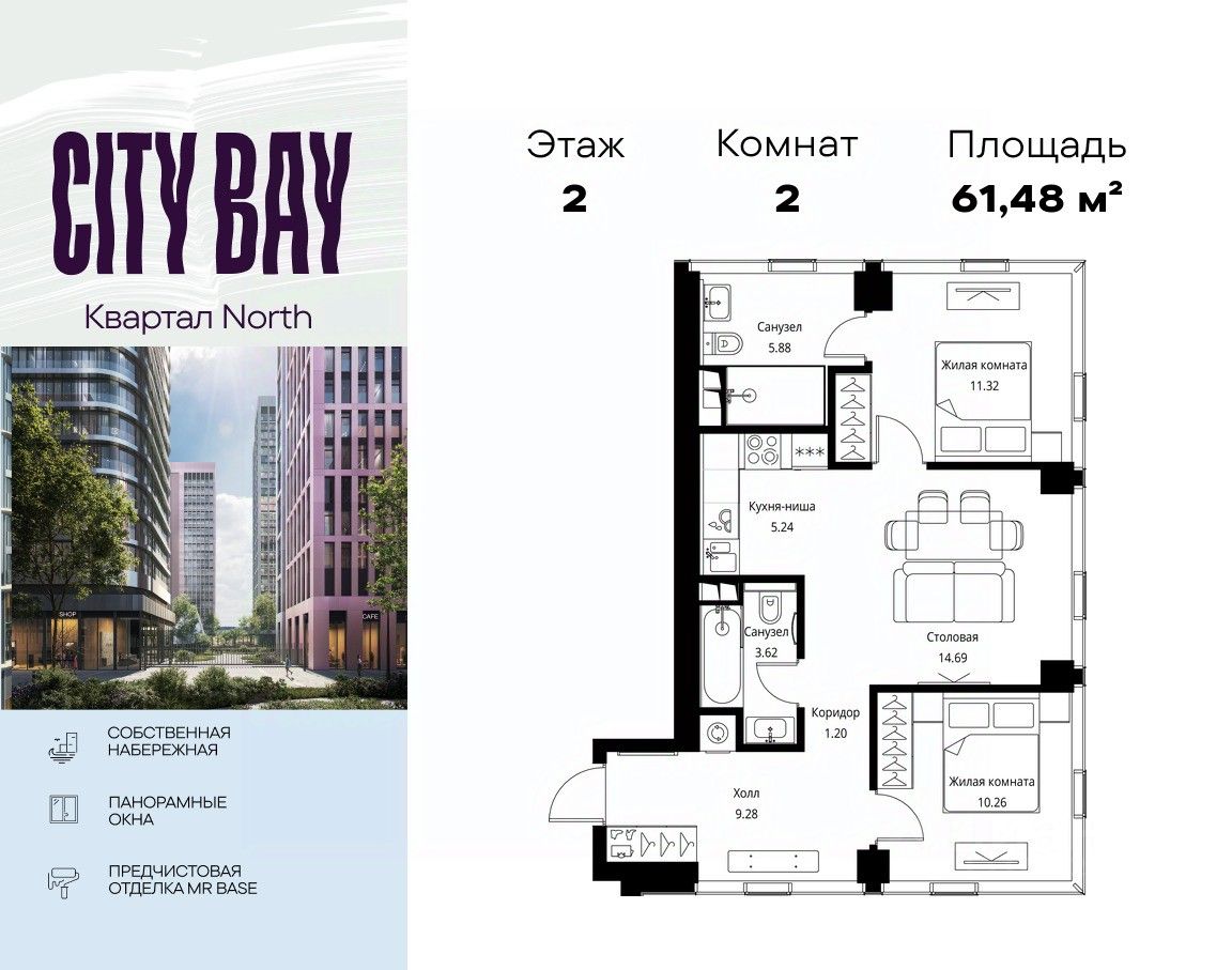 Продаётся 2-комнатная квартира общей площадью 61.48 м² с предчистовой отделкой в ЖК City Вау, квартале North, на 2-м этаже 48 этажного дома.