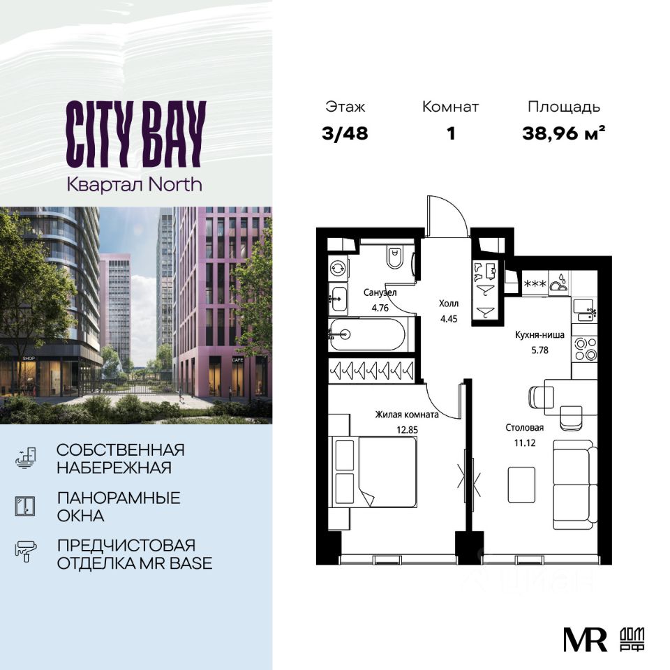 Продаётся 1-комнатная квартира общей площадью 38.96 м² с предчистовой отделкой в ЖК City Вау, квартале North, на 3-м этаже 48 этажного дома.