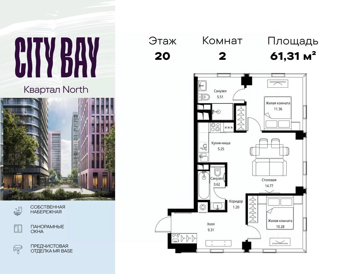Продаётся 2-комнатная квартира общей площадью 61.31 м² с предчистовой отделкой в ЖК Сити Бэй, квартале North, на 20-м этаже 48 этажного дома.