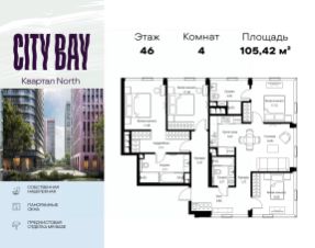 Продаётся 4-комнатная квартира общей площадью 105.42 м² с предчистовой отделкой в ЖК City Вау, квартале North, на 46-м этаже 48 этажного дома.
