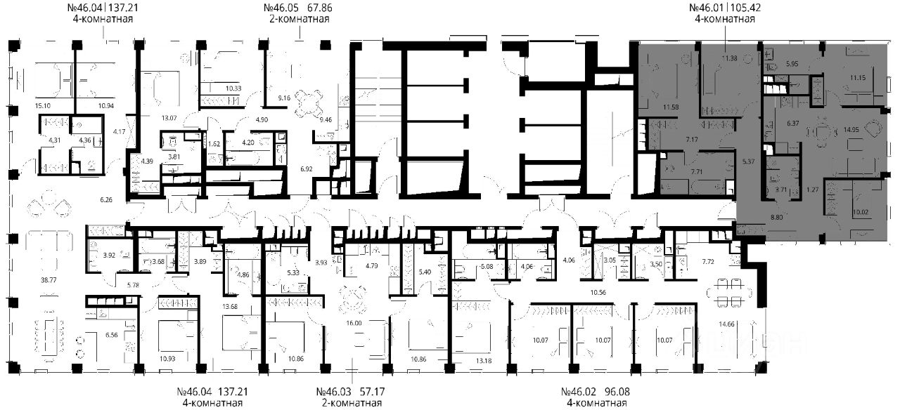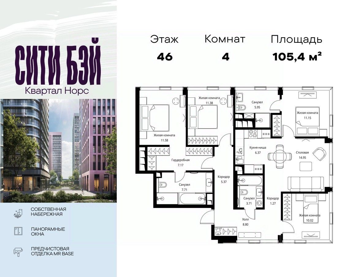 Продаётся 4-комнатная квартира общей площадью 105.42 м² с предчистовой отделкой в ЖК Сити Бэй, квартале Норс, на 46-м этаже 48 этажного дома.
