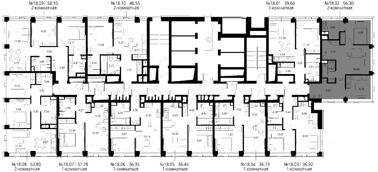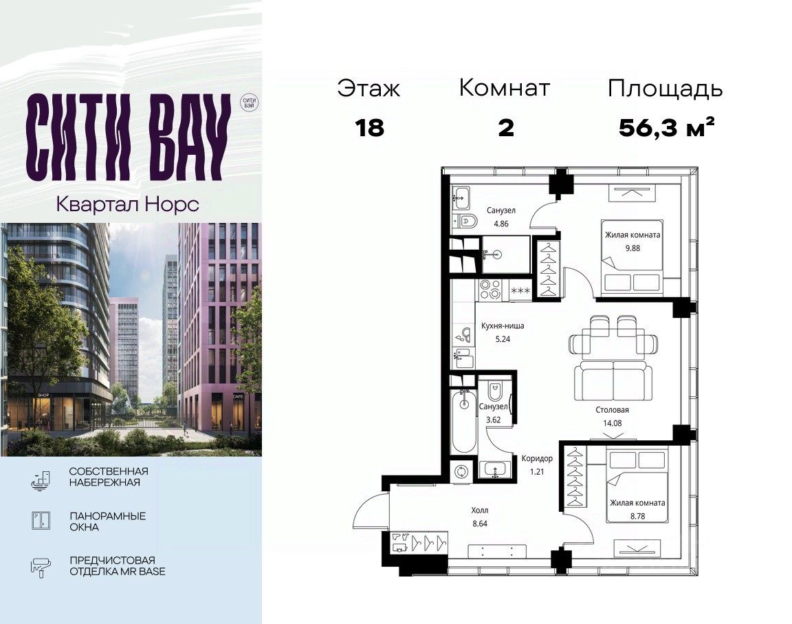 Продаётся 2-комнатная квартира общей площадью 56.30 м² с предчистовой отделкой в ЖК Сити Бэй, квартале Норс, на 18-м этаже 48 этажного дома.
