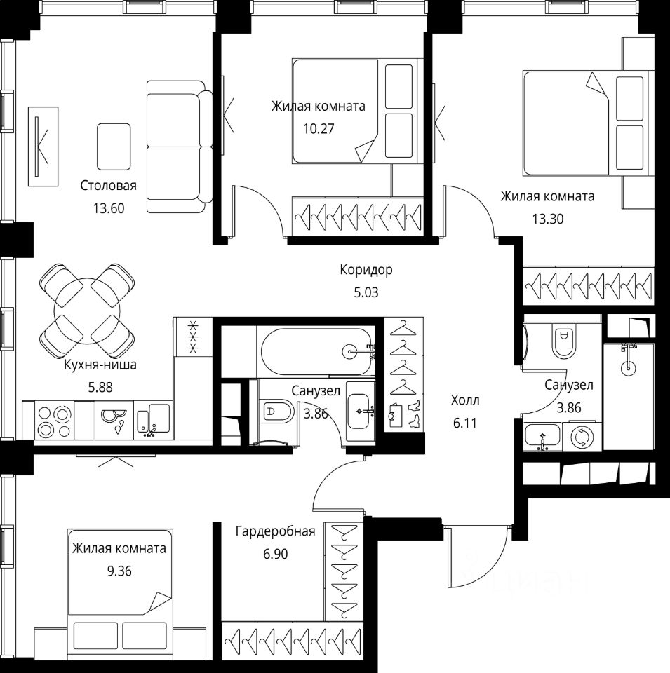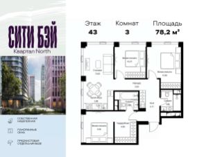 Продаётся 3-комнатная квартира общей площадью 78.17 м² с предчистовой отделкой в ЖК Сити Бэй, квартале Норс, на 43-м этаже 48 этажного дома.