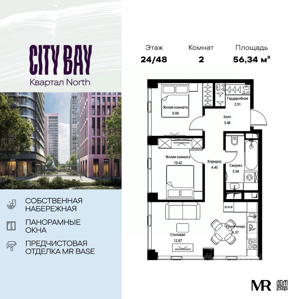Продаётся 2-к квартира общей площадью 56.34 м² с предчистовой отделкой в ЖК City Вау, квартале North, на 24-м этаже 48 этажного дома.