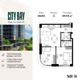 Продаётся 2-к квартира общей площадью 59.93 м² с предчистовой отделкой в ЖК City Вау на 33-м этаже 53 этажного дома.