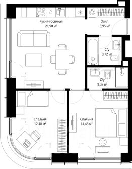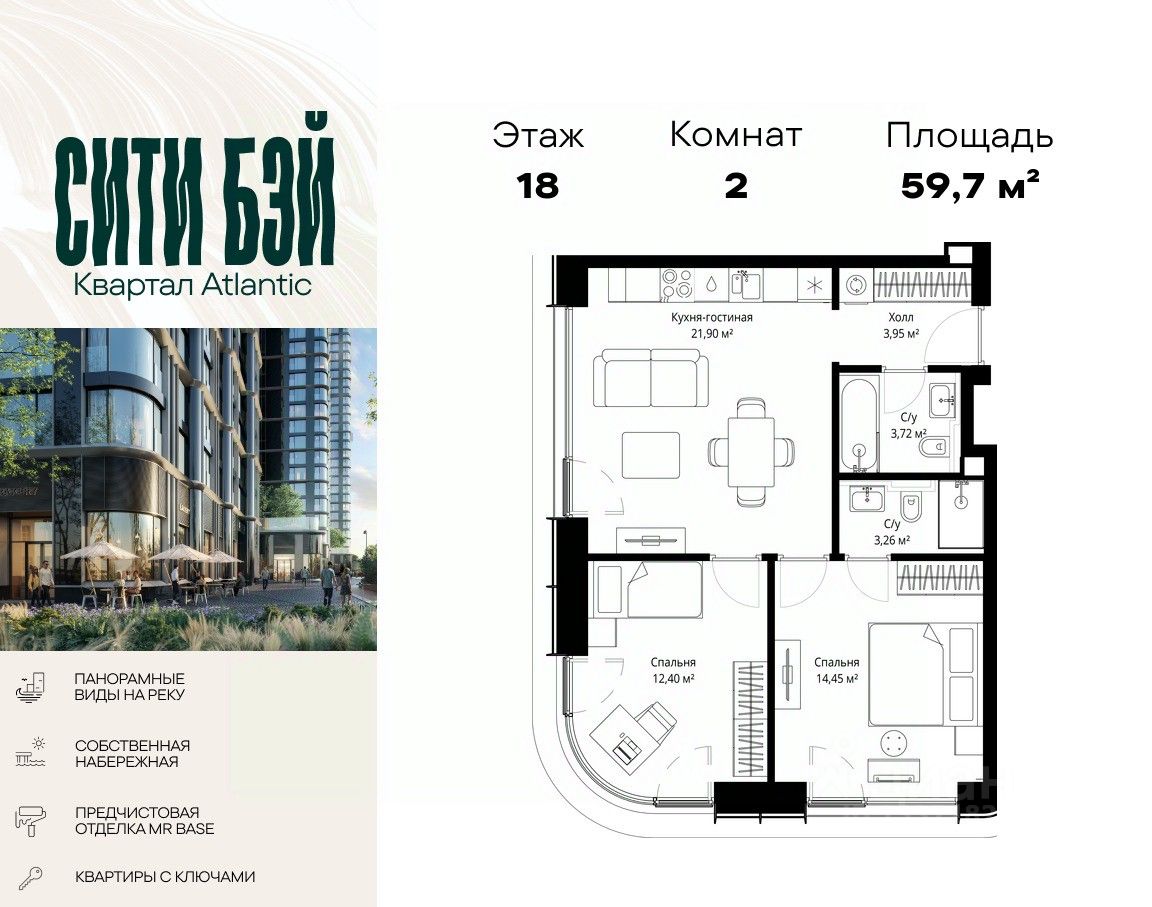 Продаётся 2-комнатная квартира общей площадью 59.68 м² с предчистовой отделкой в ЖК Сити Бэй на 18-м этаже 53 этажного дома.